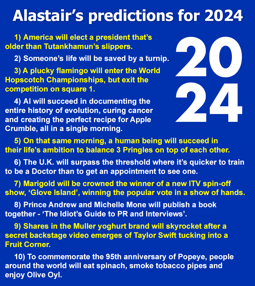 After being so wildly successful with my 2023 predictions, I was asked (by nobody) to write some for 2024. Watch all these come true…